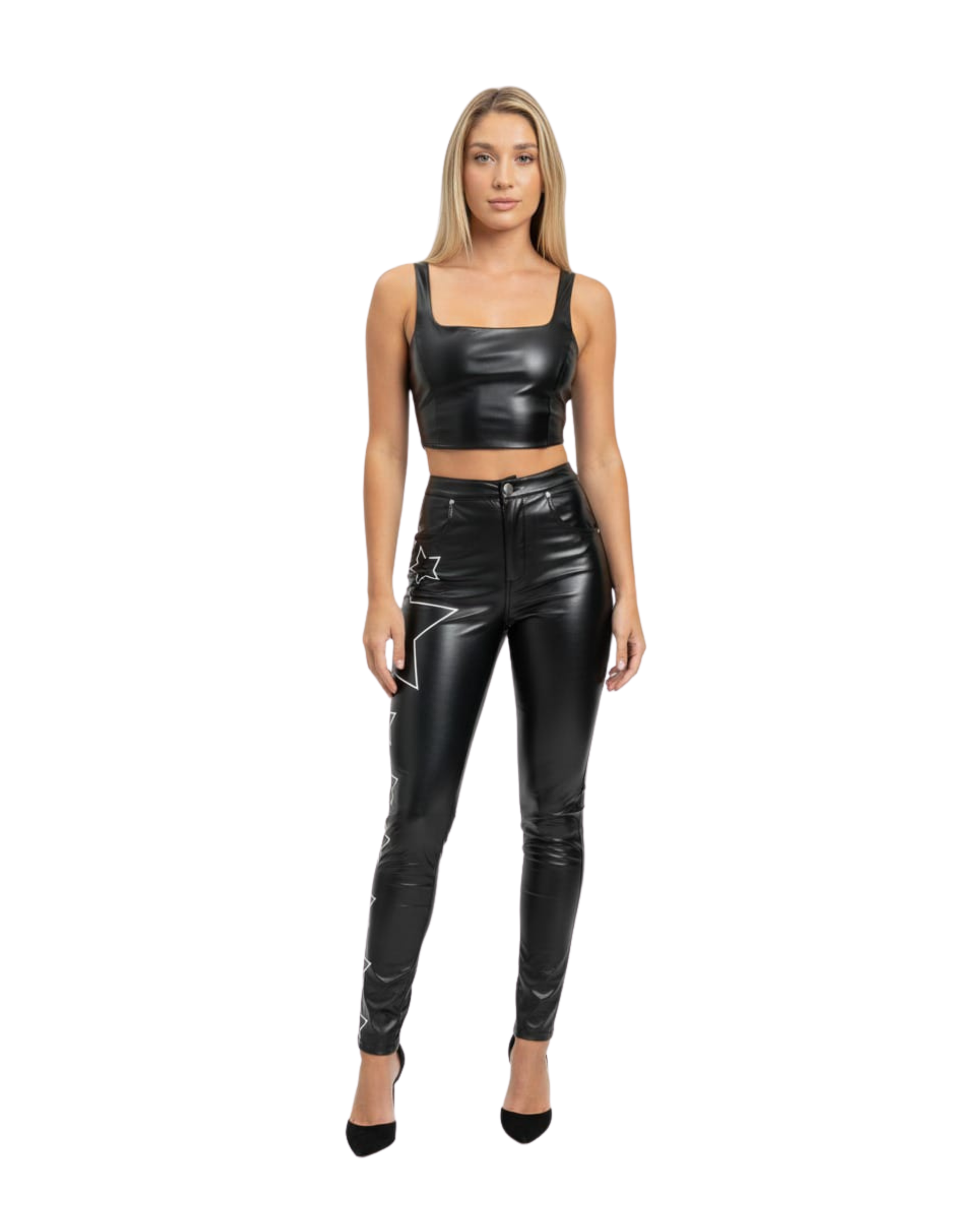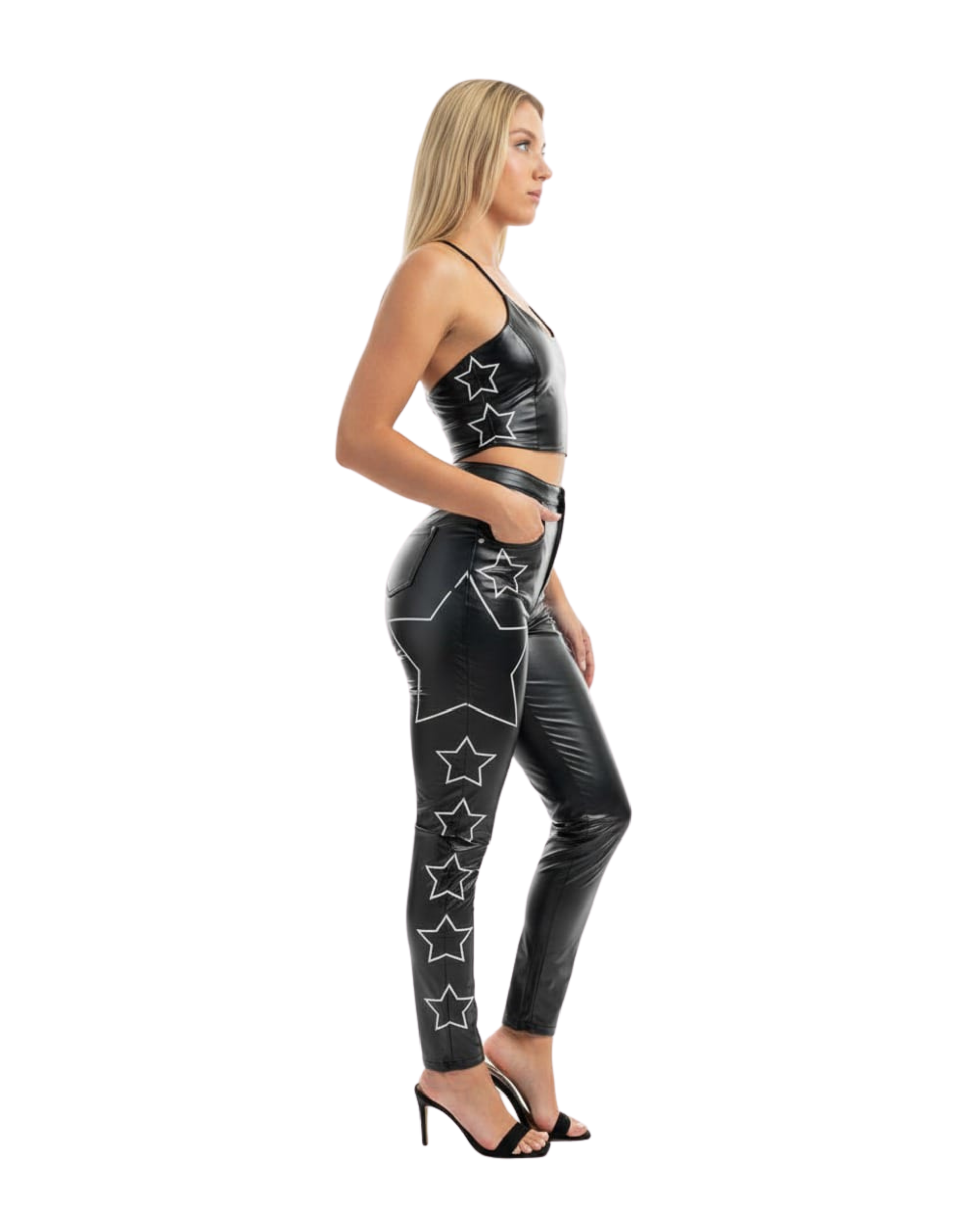 Step into your boldest cosmic era with the Dark Matter Set — a sleek, high-shine ensemble made for nights that blur the line between fashion and fantasy. This matching top-and-pants duo delivers the perfect blend of attitude and edge, crafted in glossy faux leather with striking star detailing that feels straight out of a neon-lit galaxy.
