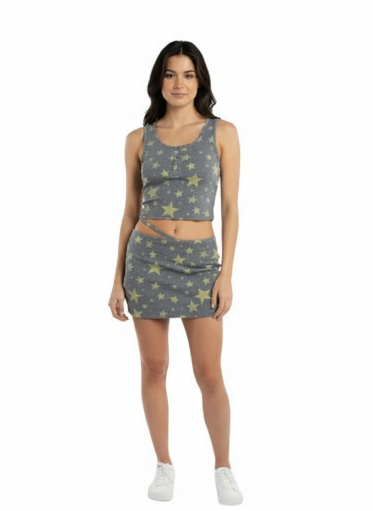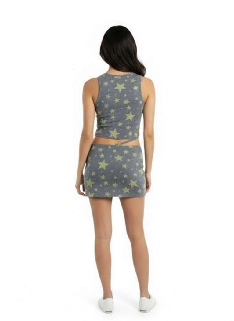 Your newest standout co-ord is here — the Galaxy Mist Set, crafted with a dreamy washed-grey palette and scattered soft-yellow star prints for a look that feels equal parts cosmic and effortless. This matching top-and-skirt duo is made for days when you want comfort with statement energy. Wear them together for a full celestial moment, or mix and match to style the stars your way.