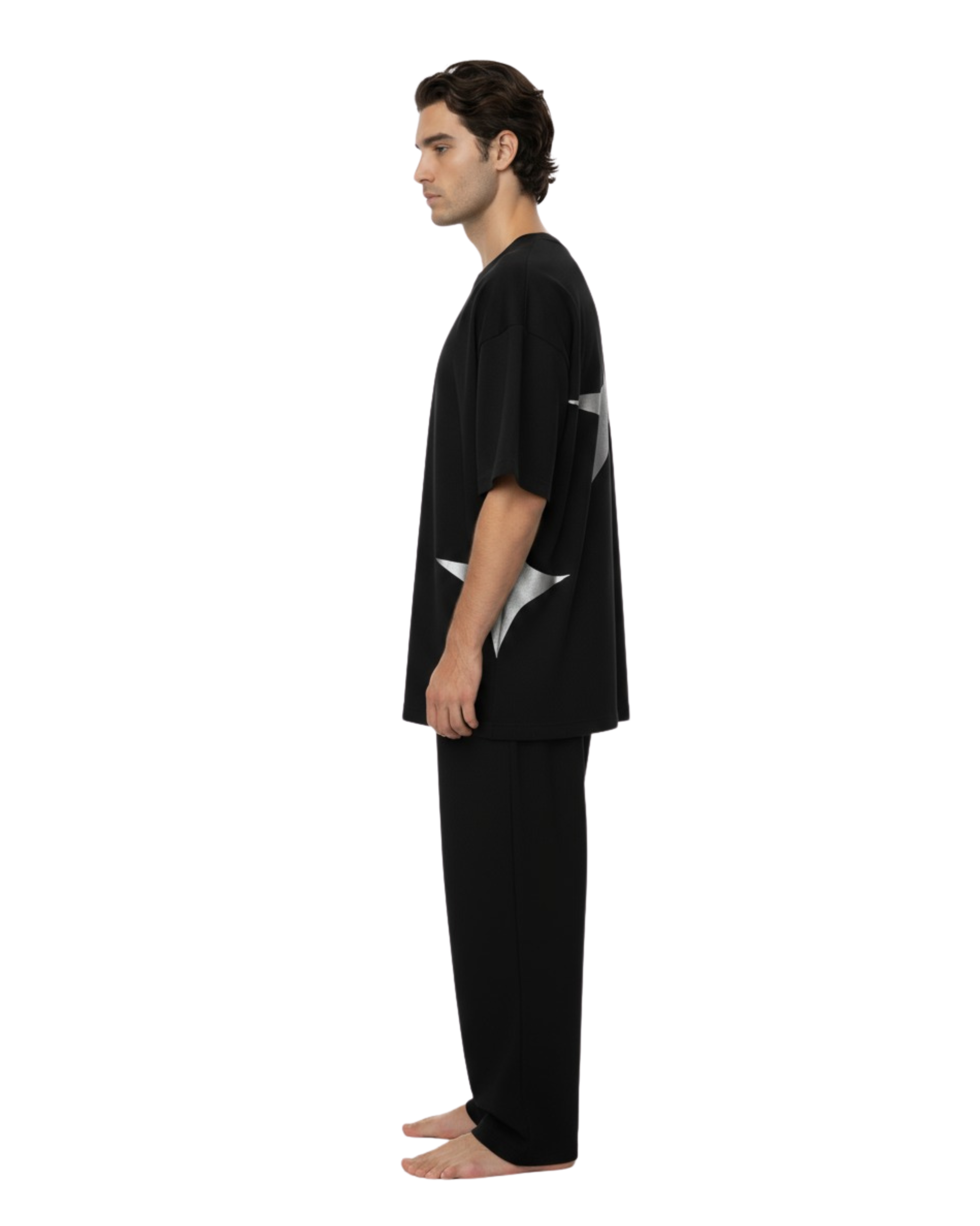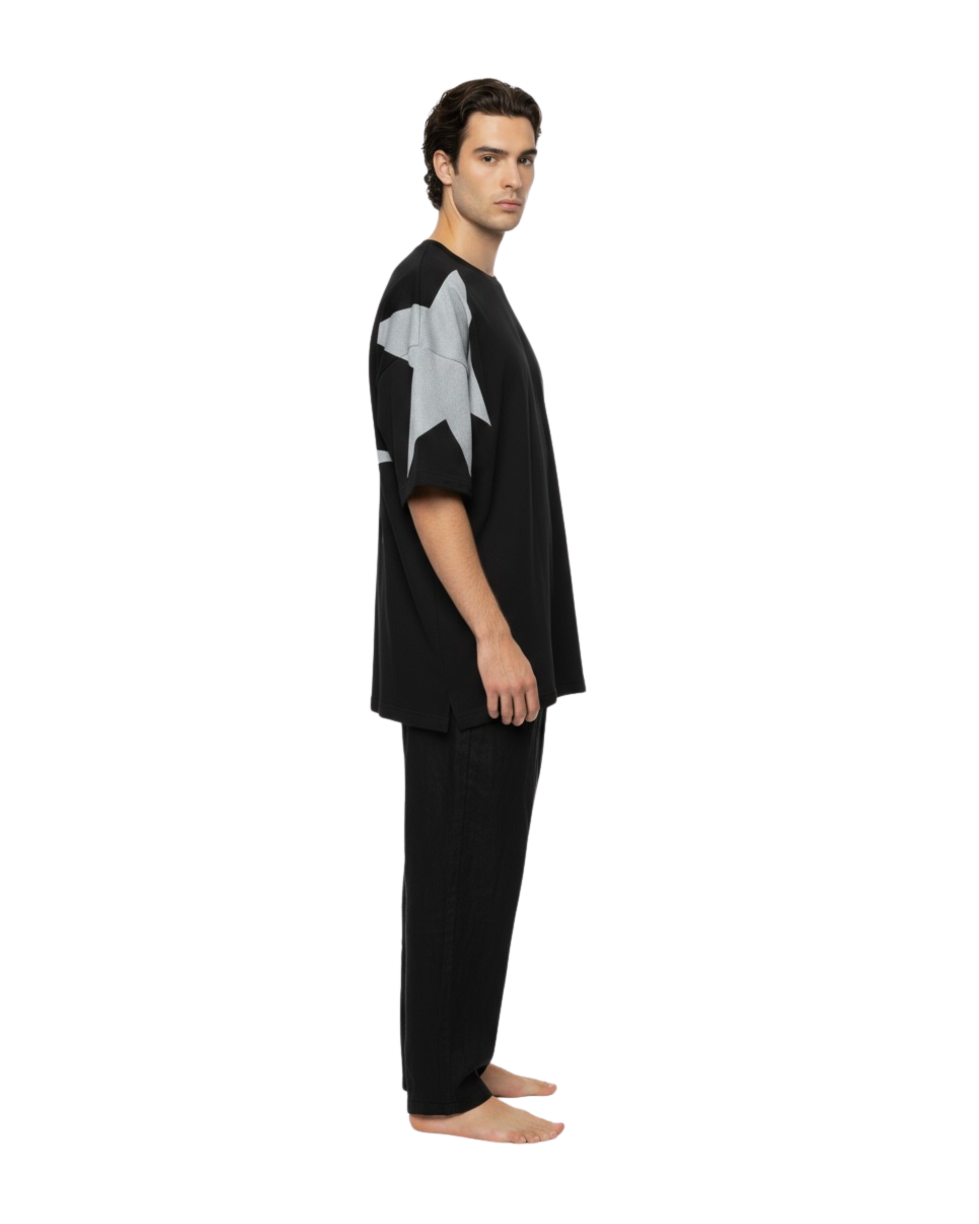 So your new everyday essential from our Point Stars collection — crafted with a clean, structured silhouette and a bold multi-star graphic that wraps around the tee for a striking, modern cosmic look. This piece brings effortless style and standout energy to any outfit, day or night.