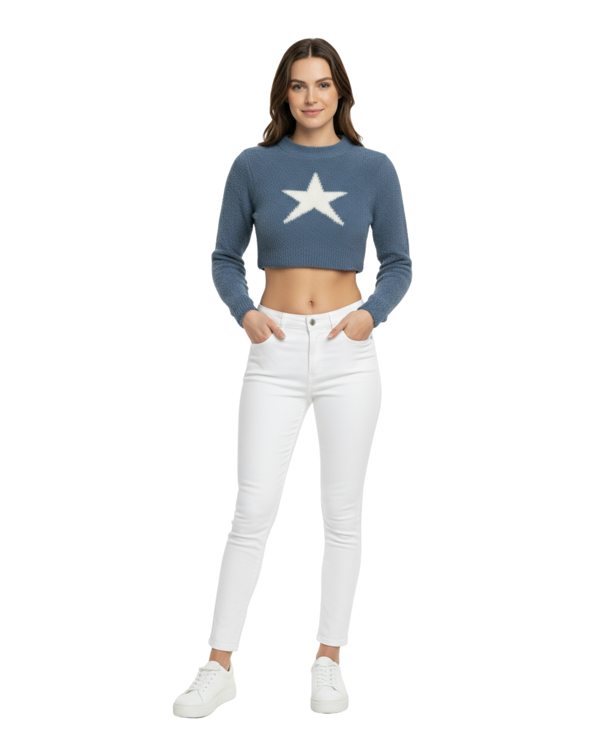 Your new cozy-meets-cosmic essential from our Point Stars collection — the Shooting Star Knit brings playful star energy to a soft, textured sweater silhouette. Designed with a cropped length and a bold star motif at the center, this knit blends comfort, personality, and effortless styling potential. The chunky-knit feel and relaxed fit make it a perfect throw-on piece for cooler days.