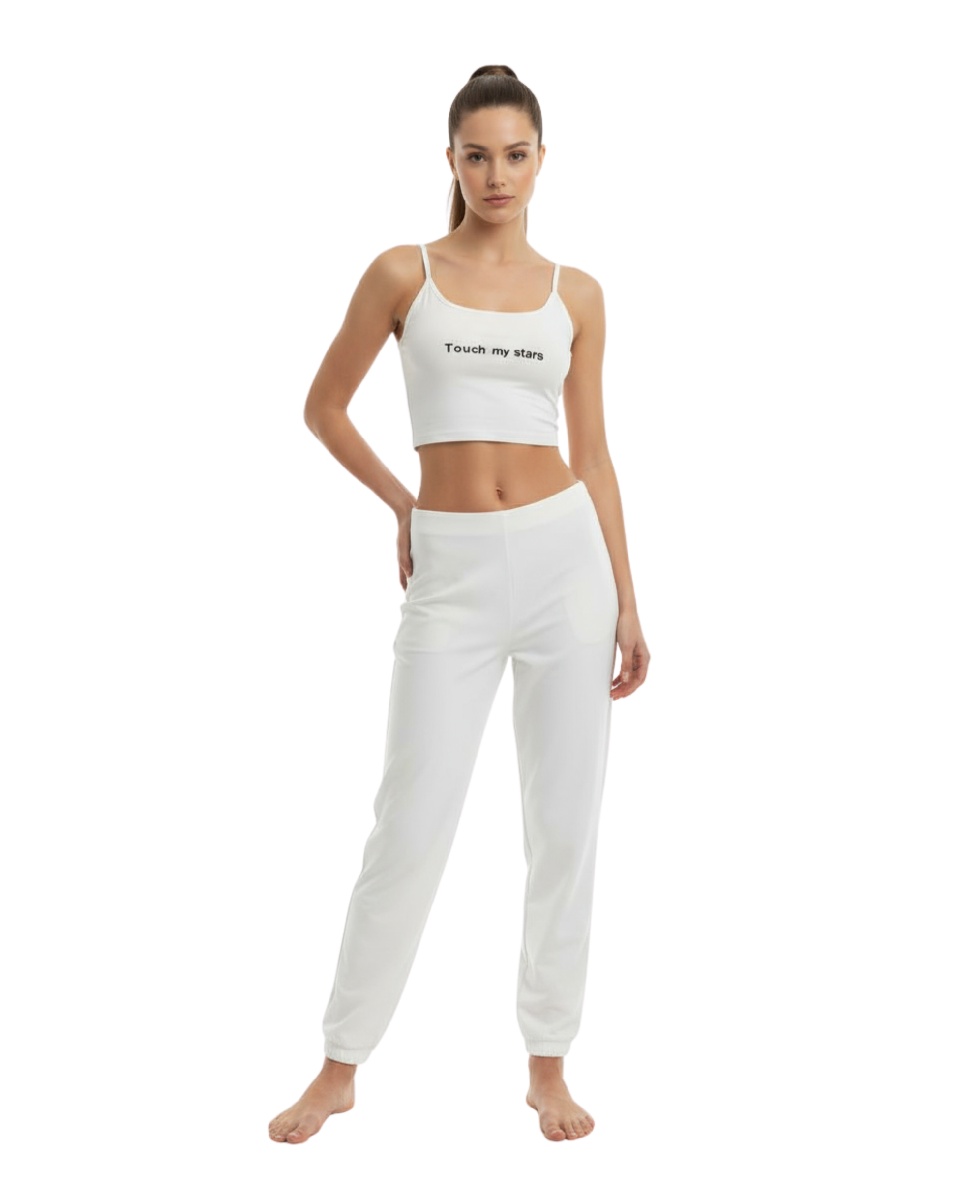 Meet the playful essential your wardrobe has been waiting for — the Stars Touch Top. Designed with a sleek, minimal silhouette and a bold “Touch my stars” front print, this cropped tank blends confidence with comfort. The soft stretch fabric and slim straps create a flattering, easy-to-wear shape that pairs effortlessly with joggers, jeans, or layered fits.