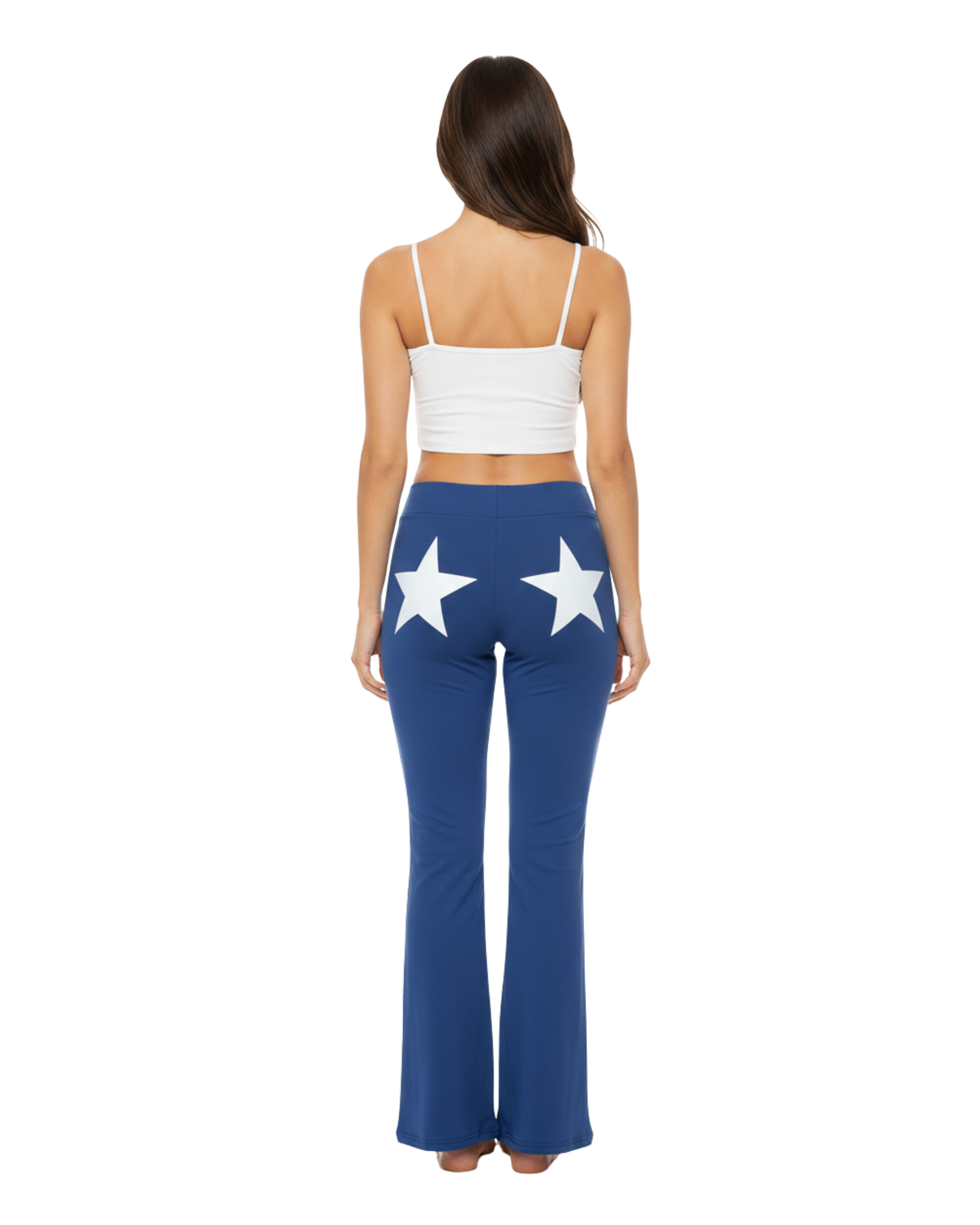 Your new bold essential from our Point Stars collection — the Twin Cosmos Flares Pants are designed to stand out while keeping comfort first. Crafted in a deep cosmic blue with two oversized star patches on the back, these flares deliver playful attitude with a sleek, flattering silhouette. The smooth, stretchy fabric hugs comfortably through the hips and thighs before widening at the hem for that perfect flare effect.