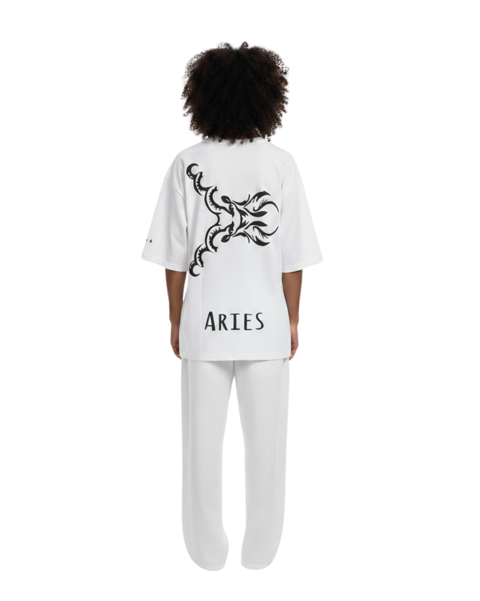 So here’s your new standout essential from our Zodiac Signs collection — crafted from smooth premium cotton and designed with a relaxed oversized silhouette. The back features a bold artistic Aries ram symbol, expressing courage, passion, and unstoppable forward energy. The clean white base combined with the striking black artwork creates a powerful and modern zodiac aesthetic.